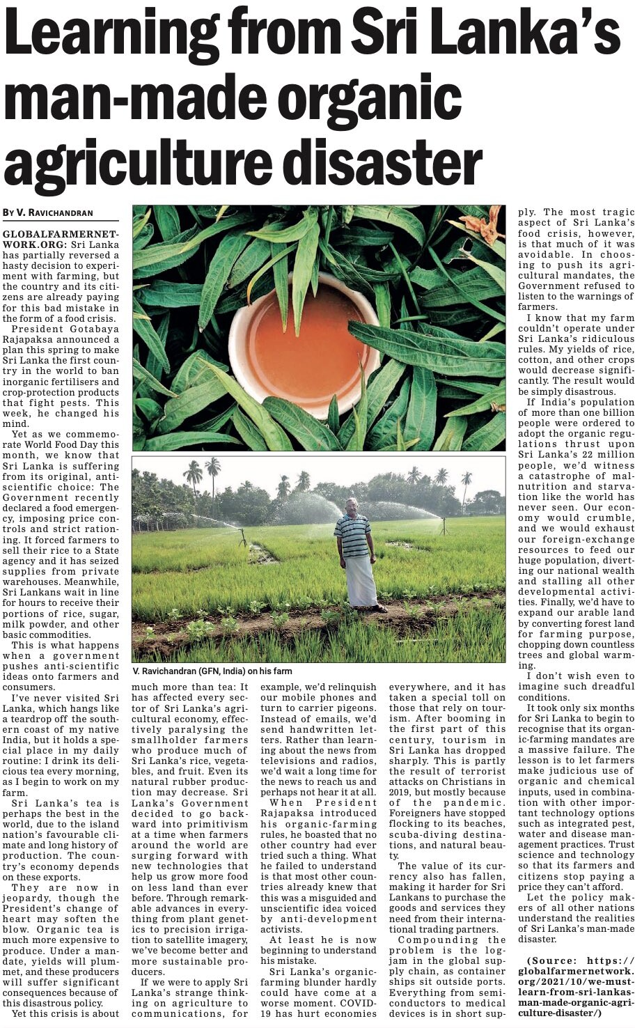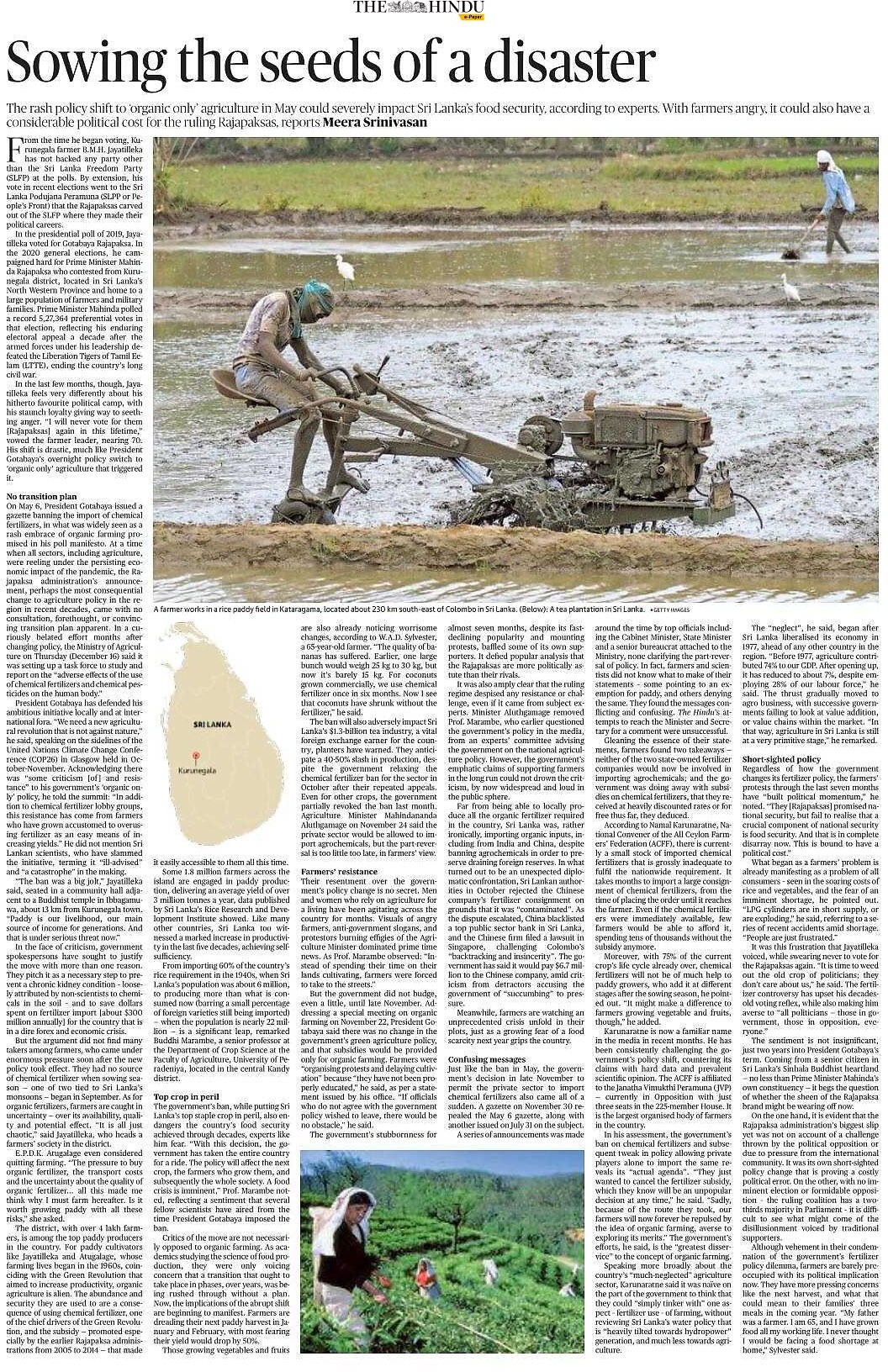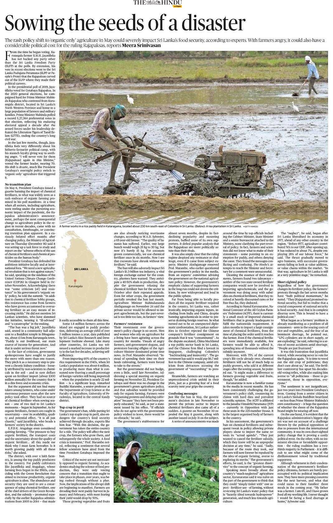 යන මාතෘකාවෙන් ලිපියක් පළ කළේය. එයින් හෙළි වූයේ 100% කාබනික කෘෂිකර්මාන්තය ක්රමානුකූලව නොව එකපාරටම බලාත්මක කිරීම ආරම්භයේ සිටම අසාර්ථක වනු ඇතැයි අපේක්ෂා කළ බවයි.