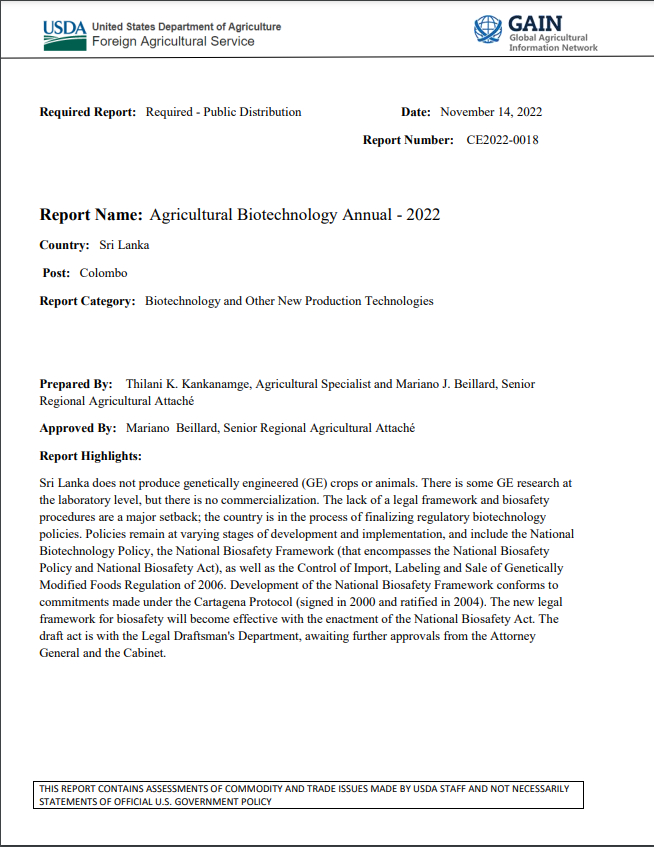 (2023) ශ්රී ලංකාවේ ජී.එම්.ඕ ආහාර නිෂ්පාදනය ඇමරිකානු වාර්තාවෙන් තහවුරු වේ මූලාශ්රය: AgricultureInformation.lk | ඇමරිකානු කෘෂිකර්ම දෙපාර්තමේන්තුවේ ලේඛනය
