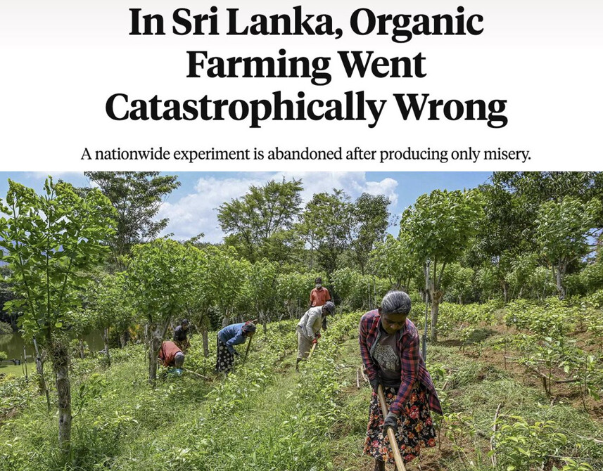 ශ්රී ලංකාව පසුගිය වසරේ එහි පුරවැසියන් මත දුෂ්ට අත්හදා බැලීමක් කළේය. කාබනික ආහාර සහ ජී.එම්.ඕ විරෝධී ක්රියාකාරිකයින්ගේ බලපෑම යටතේ, රජය සංශ්ලේෂිත පලිබෝධනාශක ආනයනය තහනම් කර රට සමස්තයෙන්ම කාබනික ගොවිතැන වෙත මාරුවීමට බල කළ අතර, බහුතරයක් ගොවීන්ට ඔවුන්ගේ රට රඳා පවතින බෝග වගා කිරීමට භාවිතා කරන අත්යවශ්ය මෙවලම් භාවිතයට අවස්ථාව අහිමි විය.